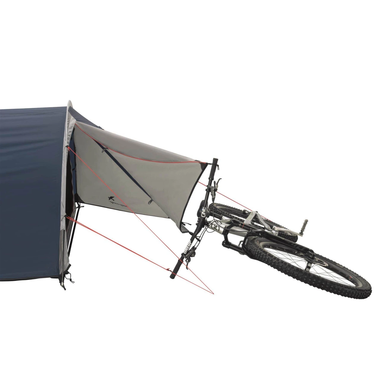 Eine schöne Fahrradtour macht man gern mit Freunden. Das Easy Camp Vega 300 Compact ist ein Tunnelzelt, was 3 Personen Platz bietet. Optimal ist es aber, wenn man zu zweit unterwegs ist, da es dann noch komfortabler vom Liegeplatz ist. Im Vega 300 gibt es zwei Eingänge, so dass man nicht übereinander krabbeln muss, wenn man aus dem – oder ins Zelt möchte. Vor den Eingängen bildet das Außenzelt 2 große Apsiden, in denen ihr eure Ausrüstung lagern könnt. Die Zugänge zum Innenzelt sind verschieden gearbeitet. Ein Eingang wird seitlich weggerollt, so dass ihr bei schlechtem Wetter optimal geschützt seid. Der andere Eingang kann komplett geöffnet werden, so dass ihr hier z.B. gut kochen könnt. Wenn ihr die Gummischlaufen vom Haupteingang an den Lenkern der Fahrräder befestigt, entsteht ein Vordach, was euch zusätzlichen Sonnenschutz bietet.