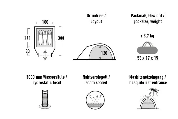 Das High Peak Nevada 3.0 ist ein geräumiges Campingzelt für bis zu drei Personen. Wie alle High Peak Zelte hat auch dieses Zelt einen besonders hohen UV-Schutz, was die Lebensdauer enorm erhöht. Eingeteilt in Vorraum und Innenzelt können nasse und schmutzige Sachen bequem und geschützt ausgelagert werden. Während der doppelte Eingang mit Mesh-Tür, unterstützt von Lüftungshauben, eine angenehme Luftzirkulation erzeugt, die das Klima im Zeltinneren stabilisieren. Zusätzlich erlangen auf diese Weise lästige Insekten keinen Zugang ins Innere – erholsamer Schlaf ist Dir garaniert. Ein leichtes, aber stabiles Fiberglasgestänge sowie eine praktische Zelttasche erleichtern die Handhabung und machen das Nevada 3.0 zu einer idealen Wahl.