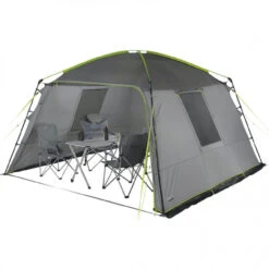 Der leicht aufzubauende High Peak Pavillon Cabana ist ein freistehender Pavillon. Aufgebaut wird er mit einem 12,7 mm Fiberglass-Gestänge und 19 mm Stahlwinkeln. Der Fronteingang ist entweder teilbar oder komplett zu öffnen. Der Pavillon hat Klarsichtfolien-Fenster mit Abdeckung und zur besseren Belüftung noch 2 Gazefenster mit Abdeckungen. Im Dach kannst du am Lampenhalter ein Licht befestigen und auch Abends noch gemütlich mit Freunden feiern.