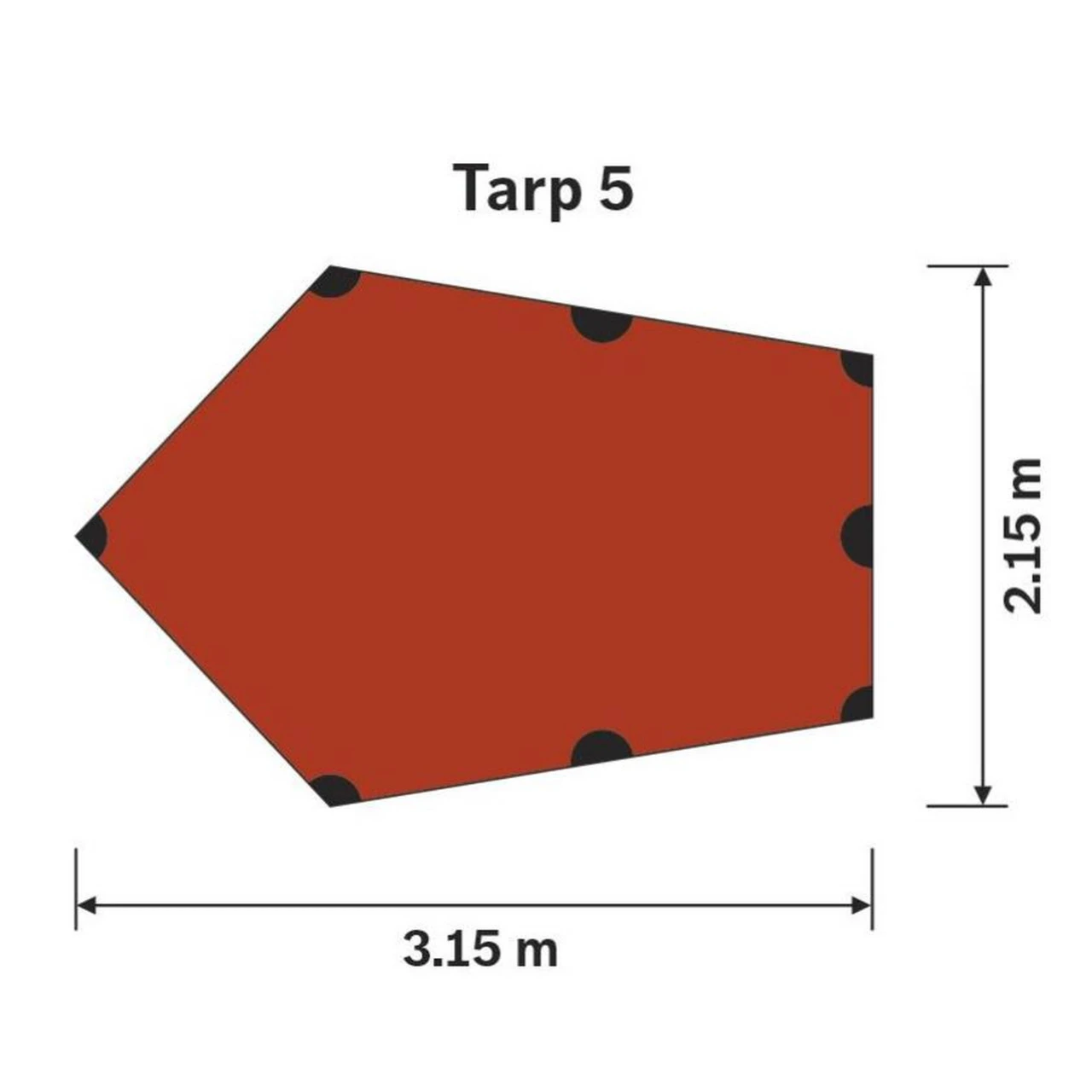 Das Hilleberg Tarp 5 ist ein sehr leichter Unterschlupf von ca. fünf Quadratmetern. Es hat eine speziell angepasste Form für eine Person. Es lässt sich ideal zum Schutz über dem Zelteingang, als separates Dach für die Outdoorküche oder als Platz zum drunter sitzen wenn es regnet. Es hat vormontierte Abspannleinen mit justierbaren Leinenspannern. Der Packbeutel ist im Tarp eingenäht und kann daher nicht verloren gehen. Das Hilleberg Tarp 5 ist einfach im Rucksack zu verstauen.