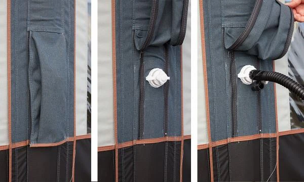 Dank des benutzerfreundlichen Verriegelungssystems „On/Off“ kann jeder Luftkanal separat abgedichtet werden, was ein Höchstmaß an Sicherheit bietet. Zusätzlich stehen zur Abdichtung am Wohnwagen zwei zusätzliche Luftschleusen zur Verfügung. Je nach Form des Wohnwagens können diese separat aufgeblasen werden, um sich optimal an Ihren Wohnwagen anzupassen.