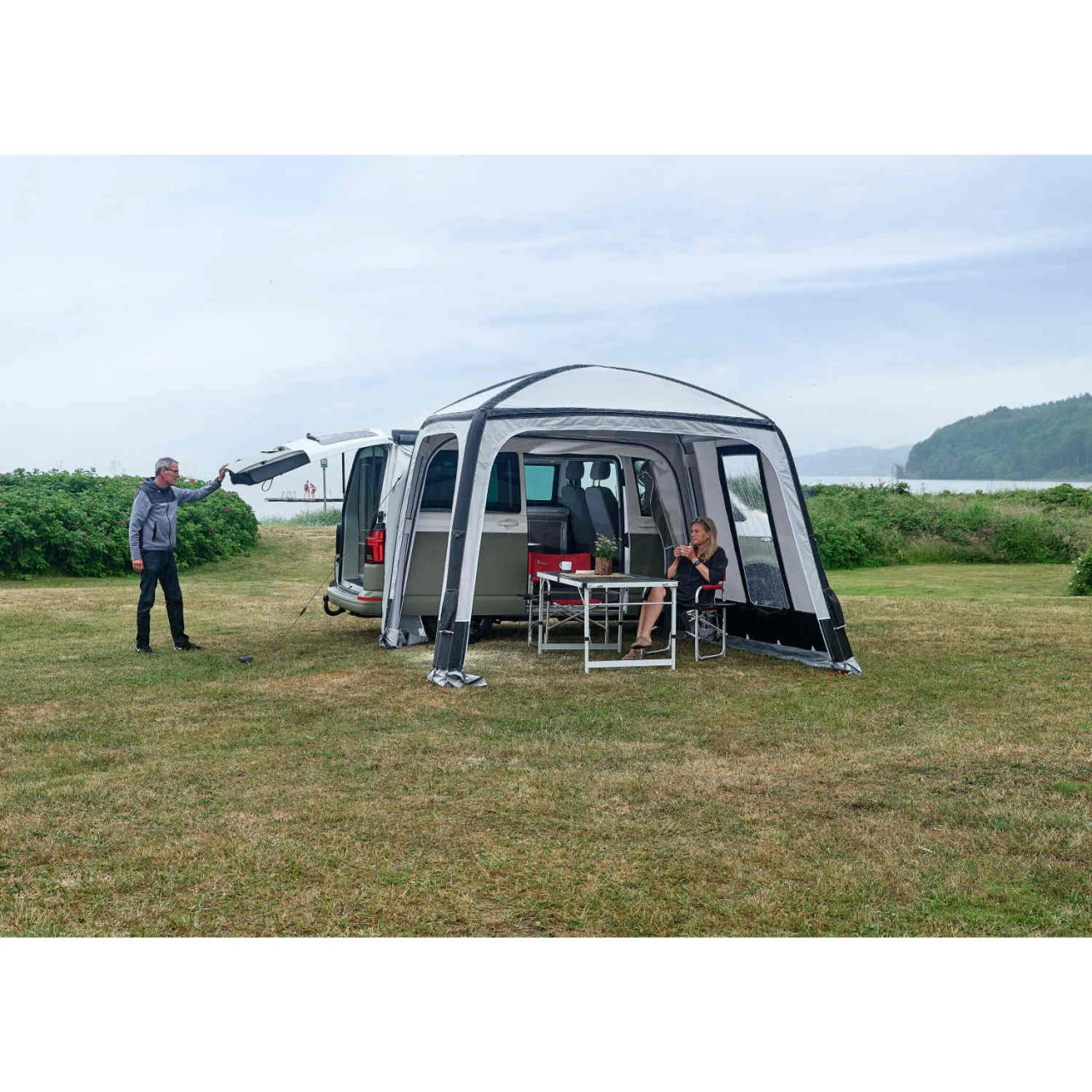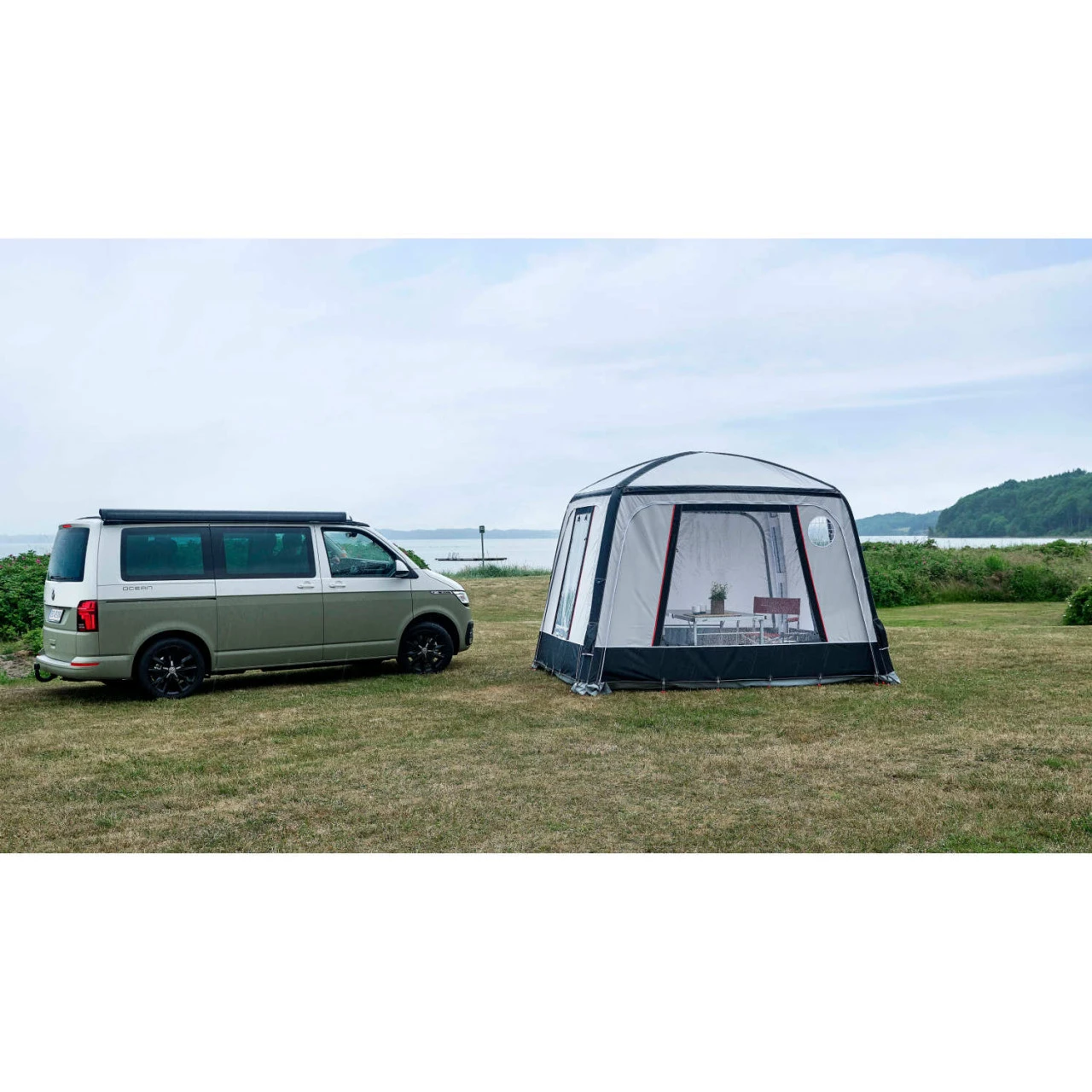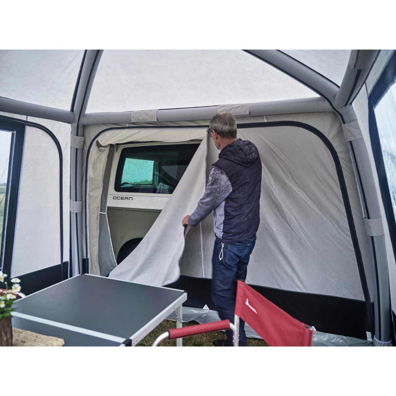 Das Busvorzelt von Isabella kann sogar als Platzhalter auf dem Campingplatz stehen bleiben, während du mit dem Campingbus die Umgebung erkundest. Die Schleuse deines Campingbusses kann problemlos in nur 1-2 Minuten abmontiert werden, und die Rückseite lässt sich ganz einfach mit einem Reißverschluss verschließen.