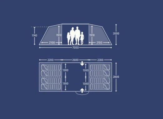 Das Kampa Watergate 8 Familienzelt bietet genug Platz und Privatsphäre für die ganze Familie. Die Schlafkabinen wurden im Vis-à-vis-Stil gegenüberliegend angebracht. In der Mitte des Zeltes befindet sich ein großzügiger Wohnbereich, der auch bei schlechtem Wetter genug Platz für die ganze Familie bietet. Die großen Fenster des Watergate 8 ermöglichen viel Lichteinfall im Wohnbereich des Zeltes. Der Seiteneingang verfügt über ein kleines Vordach. Für eine optimale Belüftung wird das Belüftungssystem von den beiden Seitentüren unterstützt, die mit Moskitonetzen ausgestattet sind. Bei nasser Witterung sorgen die Belüftung über das rückseitige Paneel und die eingenähte Bodenplane für trockenen Komfort.Detailfotos können in der Farbe abweichen!
