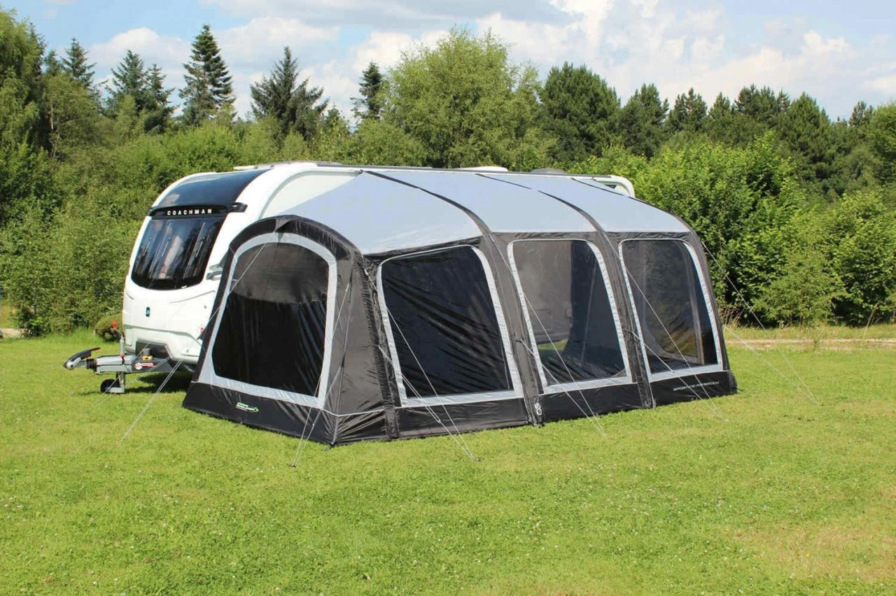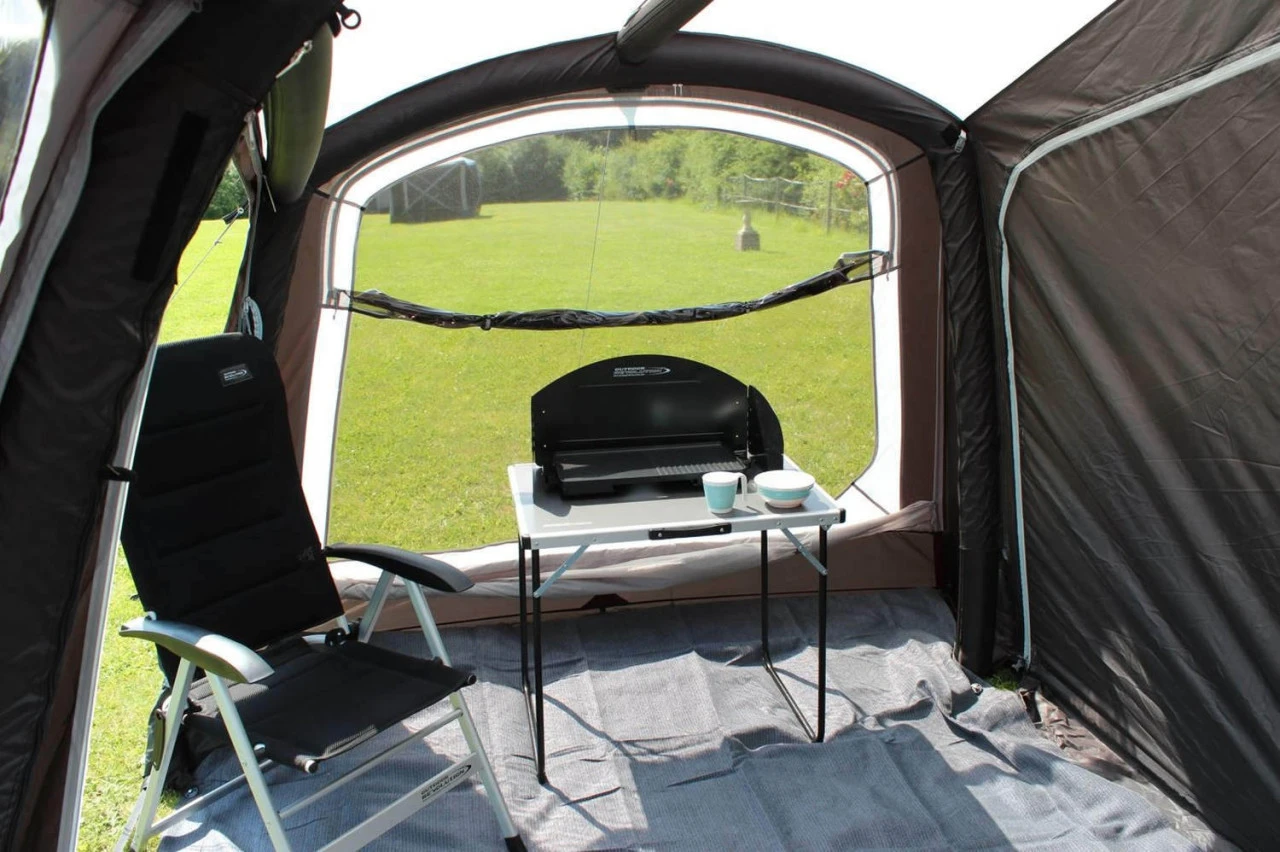 Durch den integrierten Anbau bietet dir das Outdoor Revolution Sportlite Air 320EX Wohnwagenvorzelt zusätzlichen Platz für dein Campingequipment oder für eine Sitzgruppe. Die Frontwände können zur Seite abgerollt werden oder auch zur Hälfte abgeklappt werden, um einen Veranda-Effekt zu erzielen. Für mehr Privatsphäre kannst du die Fenster im Vorzelt mit einem Reißverschluss-Vorhang auch komplett schließen. Das Outdoor Revolution Sportlite Air 320EX Wohnwagenvorzelt besteht aus einem leichten, dennoch sehr robusten und wetterfesten 280HDE Polyester Material. Dieses Material ist besonders von Vorteil, wenn geringes Gewicht im Urlaub eine Voraussetzung ist.