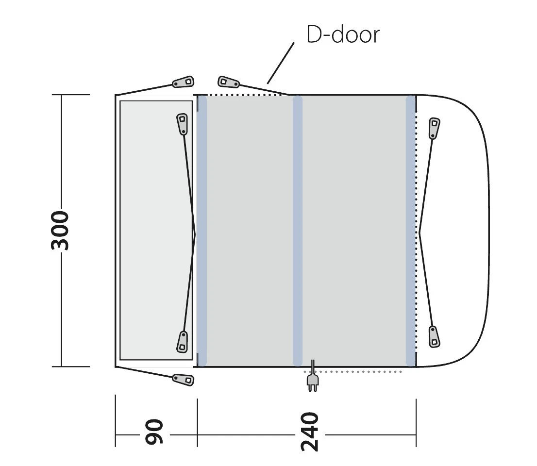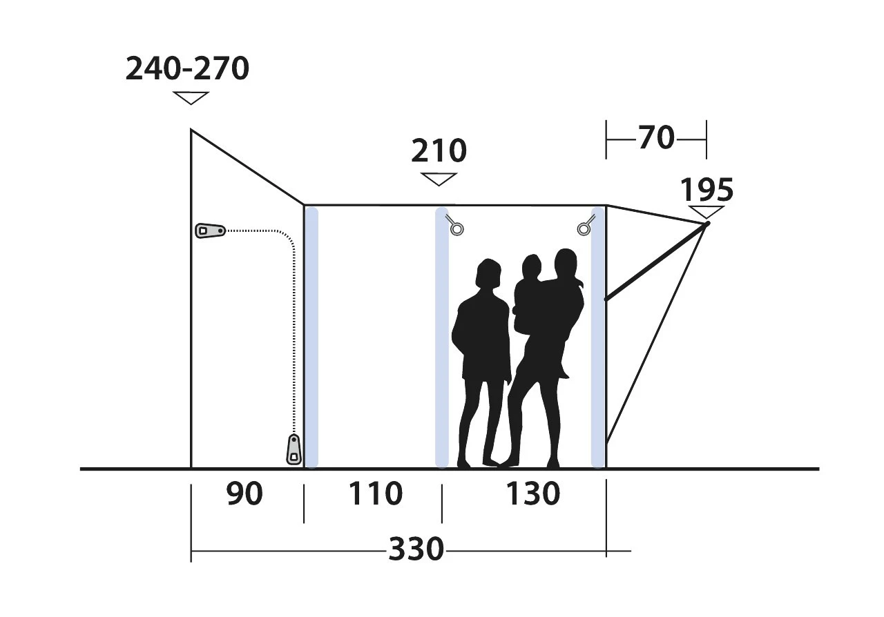 Das hohe Outwell Newburg 240 Air Tall Wohnmobilvorzelt lädt zum Verweilen und Entspannen ein. Innerhalb weniger Minuten ist das Luft-Vorzelt an Dein Fahrzeug mit einer Anschlusshöhe von 175 – 200 cm angebracht und aufgebaut. Durch die vollstänig offene Rückseite des Zeltes gelangst du problemlos zu deinem Fahrzeug. Es wurde mit großen, getönten Fenstern ausgestattet, welche problemlos mit Gardinen verschlossen werden können und Dich somit vor neugierigen Blicken schützen. Die Fronttür wurde mit einem Moskitonetz ausgestattet, welches Dich vor lästigen Insekten schützt und dir eine angenehme Belüftung ermöglicht. Ein integriertes Vordach schützt den Innenraum vor Regen, solltest Du die Tür Deines Newburg 240 Air Tall zum Lüften geöffnet lassen. Bei sonnigem Wetter findest Du hier ein kleines schattiges Plätzchen. Damit Dein Zelt ein wenig wohnlicher wird, verfügt das Zelt über das HookTrackSystem. Dieses System bietet Dir vielseitige Möglichkeit Gegenstände oder Lampen aufzuhängen. Der Tunnel wurde mit zwei Türen und Moskitonetz ausgestattet. Doppelt angebrachte Keder (Stärke 5 mm) sorgen dafür, dass Du Dein Fahrzeug ohne Probleme anbringen kannst. Ein abgedunkelte Schlafkabine ist optional erhältlich.
