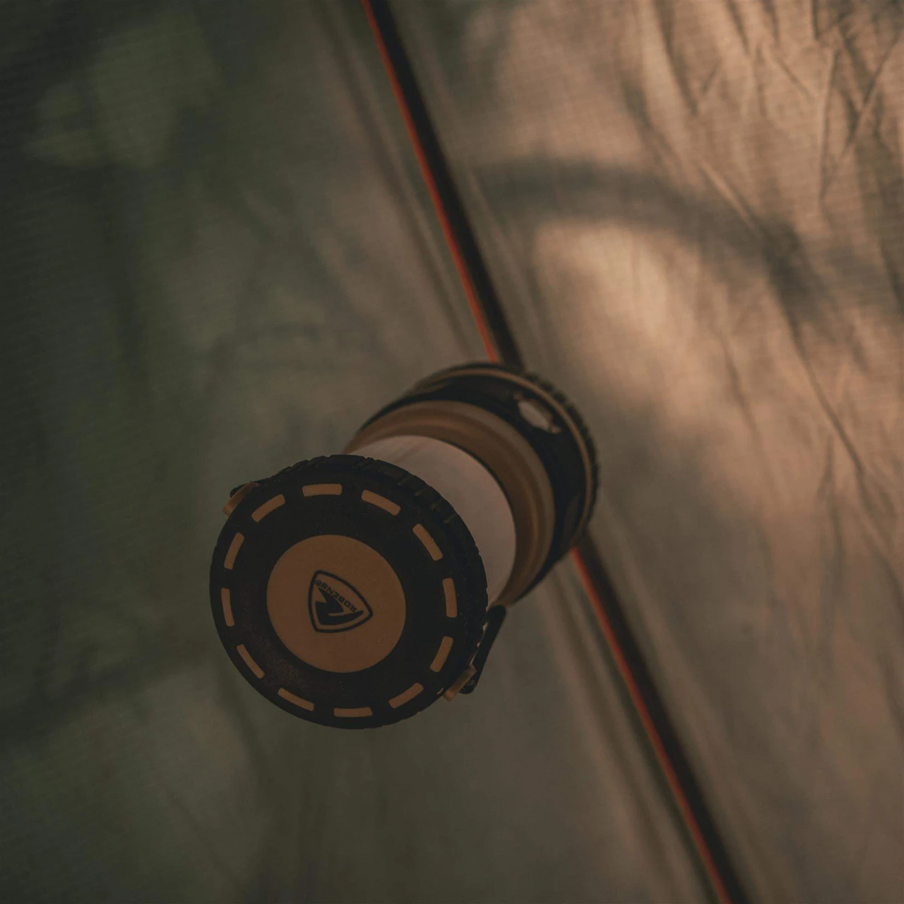 Eine verstellbare Trockenleine, an der nasse Handtücher getrocknet werden können, und der Aufhängepunkt für eine Laterne sorgen dafür, dass man auch Abends bequem unter dem Twin Summit Shelter PRS sitzen kann.