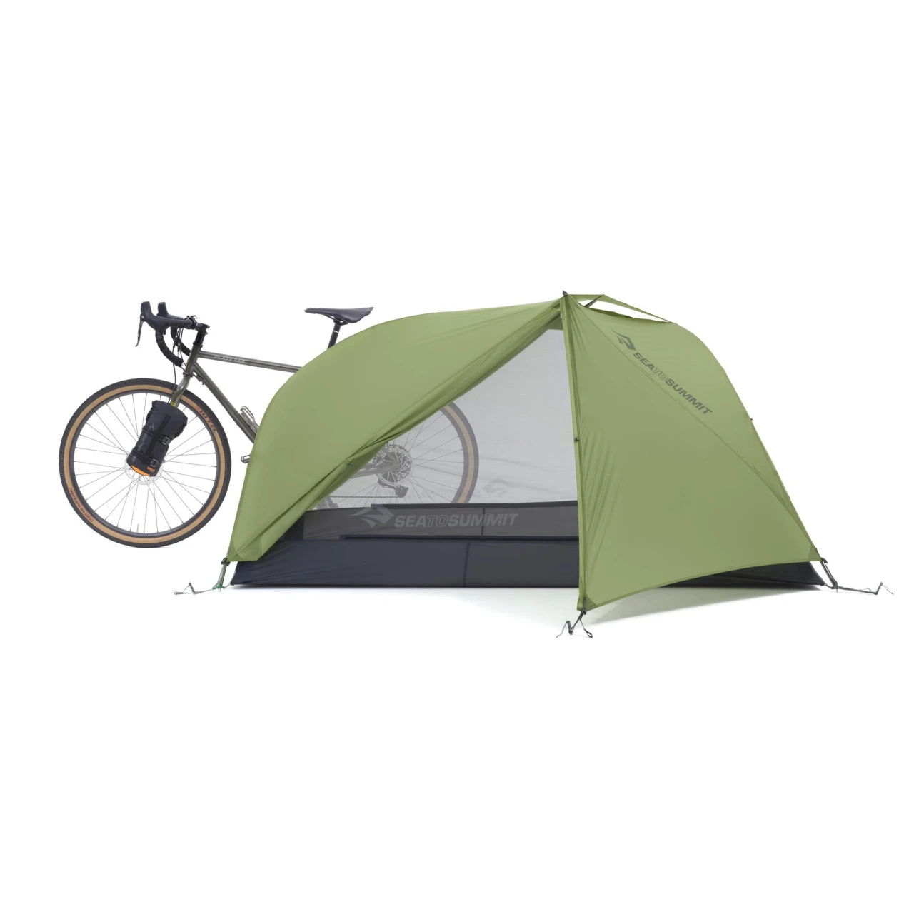 Das Telos TR2 Bikepack Zelt von Sea to Summit ist speziell für Fahrradfahrer konzipiert worden. Die Gestänge Segmente sind kürzer, damit sie in einen kleineren Packsack passen. Die beiden wasserdichten, robusten 420D Evac Dry Sacks und der Gestänge-Packsack können mit Hilfe von Stretch-Loc Straps am Fahrrad befestigt werden.
