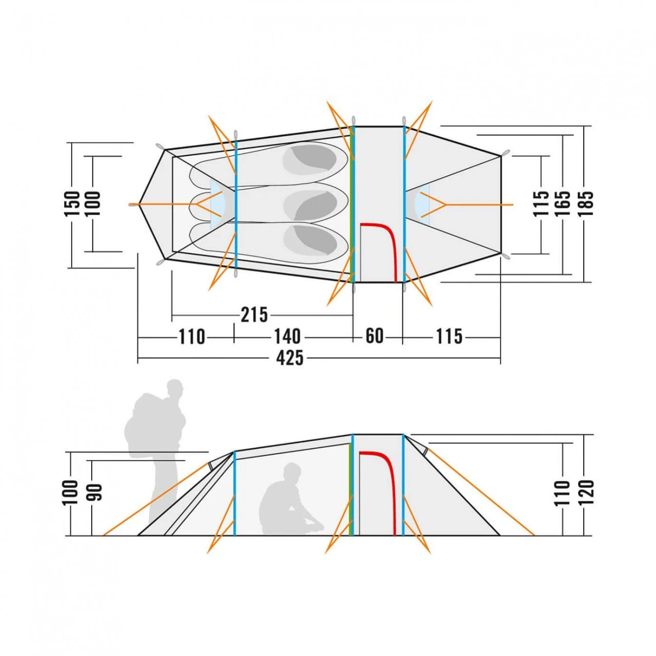 Das leichte Drei-Personen-TrekkingzeltTatonka Grönland 3 ist in einen großzügigen Schlafbereich und ein Vorzelt in der Apside zur Lagerung der Ausrüstung aufgeteilt. Das niedrige Gewicht von ca. 3,7 kg macht es ideal zum Mitnehmen auf Wanderungen. Auch bei regnerischem Wetter schlafen Sie hier gut – dank einer Wassersäule von 8000 mm, wasserdicht versiegelter Nähte und wasserdichter Verarbeitung der Abdeckungen, Lüfter und Ansatzpunkte. Der Eintritt ins Außenzelt erfolgt über einen seitlichen Eingang in der Apside, während Schlafbereich und Vorzelt durch eine weitere Tür mit Moskitofenster abgetrennt ist. Durch zwei Lüfter im Außenzelt und einen weiteren Lüfter im Innenzelt herrscht in Ihrem Grönland 3 stets frische Luft.