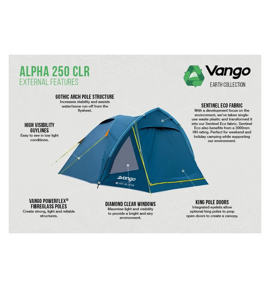 Das Vango Alpha 250 CLR ist ein Kuppelzelt für zwei Personen mit kleinem Packmaß. Optisch zeichnet es sich durch einen spitz zulaufenden gotischen Gestängebogen aus. Dieser trägt dazu bei, dass Zelt windstabil ist und begünstigt den Ablauf von Regenwasser. Die kristallklaren Fenster helfen dabei, das Zeltinnere aufzuhellen. Ein besonderes Highlight ist die Nachhaltigkeit: Das Material des Vango Alpha 250 CLR wird aus recyceltem Einwegplastik gewonnen. Die Bodenplane aus Polyethylen ist eingehängt und kann bei Bedarf herausgenommen werden.