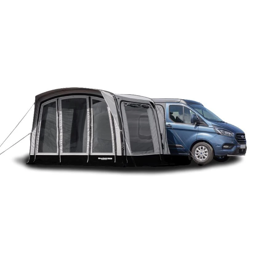Das Westfield Orion 300 Bus-und Wohnmobilvorzelt besticht durch sein schnelles und einfaches aufpumpen mittels des Advanced Air Systems®. Mit der optionalen Schleuse kannst du ganz einfach das freistehende Zelt mit deinem Fahrzeug verbinden. Das Zelt besteht aus dem innovativen, reißfesten und strapazierfähigen HydroTech® CottonTouch-Material ausgestattet, welches speziell für Reisemobile entwickelt wurde. Dieses Polyestergewebe ist besonders UV-beständig. Außerdem verleiht diese Beschichtung dem Zelt einen fühlbaren Baumwoll-Charakter. In das Innere des Orion 300 gelangst du durch eine der Türen. Der Fronteingang besitzt ein kleines Vordach und bietet dir Schutz vor Regen. Zu den weiteren Ausstattungsmerkmalen des Zeltes gehören die großen getönten Panoramafenster, die Seitenwände mit Türfunktion und Moskitonetzen mit Sichtschutz. Außerdem hast du die Möglichkeit durch einen der beiden Schleuseneingänge direkt zur Tür deines Fahrzeugs zu gelangen. Für ein gutes Zeltklima sorgt neben den getönten Fenstern auch die dauerhafte Hochentlüftung, sodass in deinem Zelt ein angenehmes Klima herrscht. Die Wände des Westfield Orion 300 Vorzelt wurden steiler konzipiert, sodass das Zelt tiefer wird und du noch mehr Wohnfläche hast. Zudem kannst du auch den Eris Anbau an die linke oder rechte Seitenwand mittels Reißverschluss anzippen.