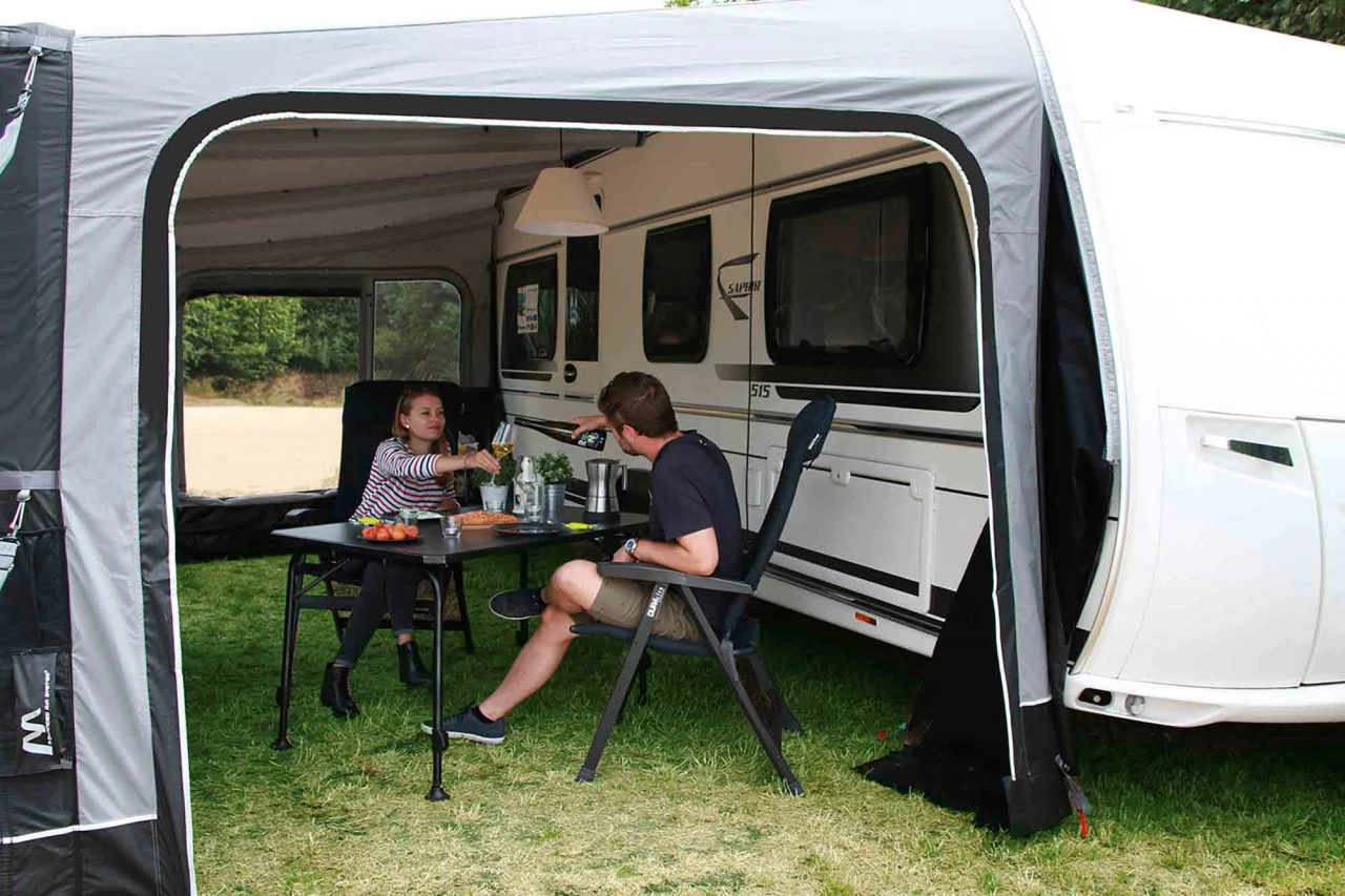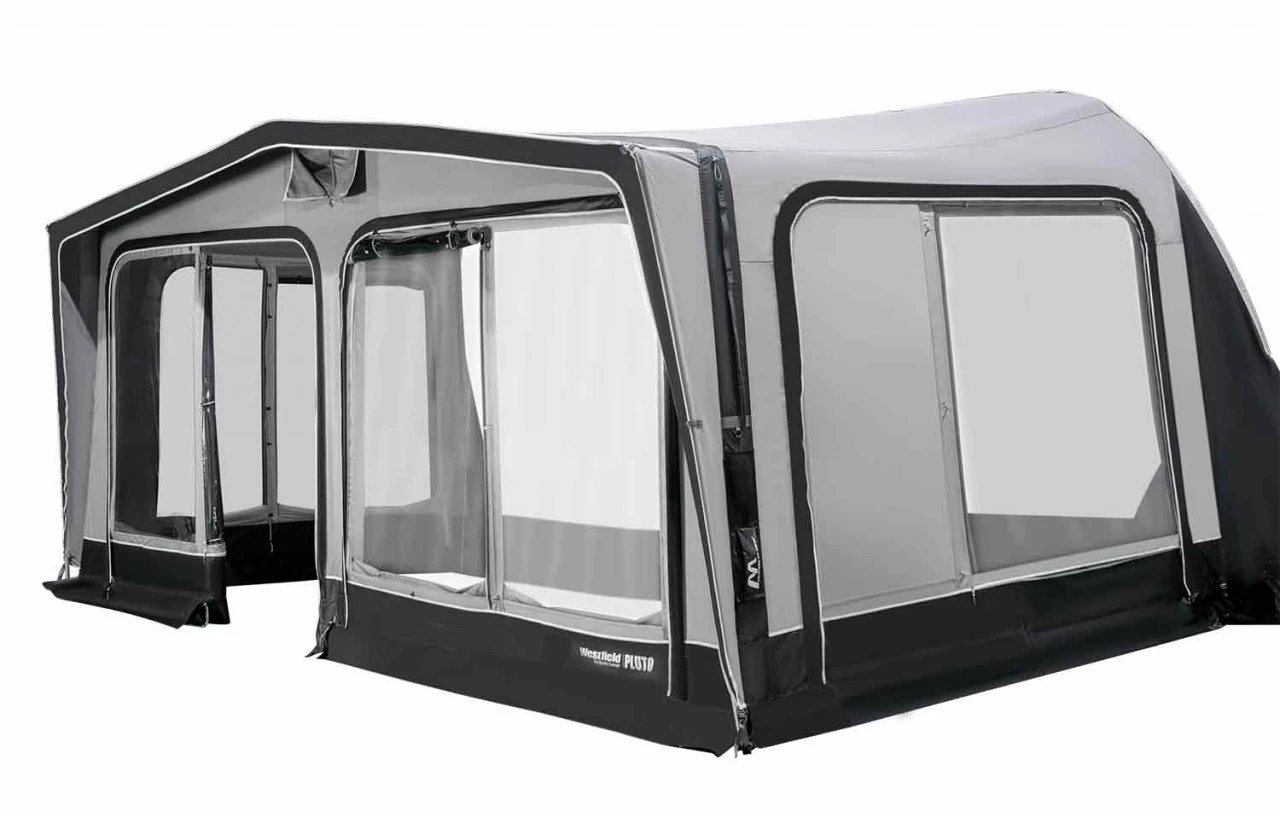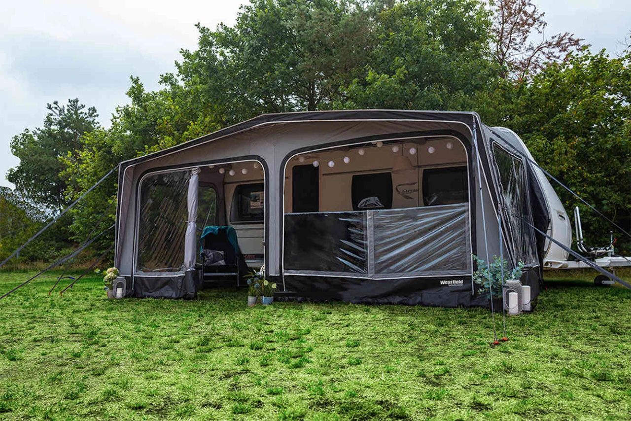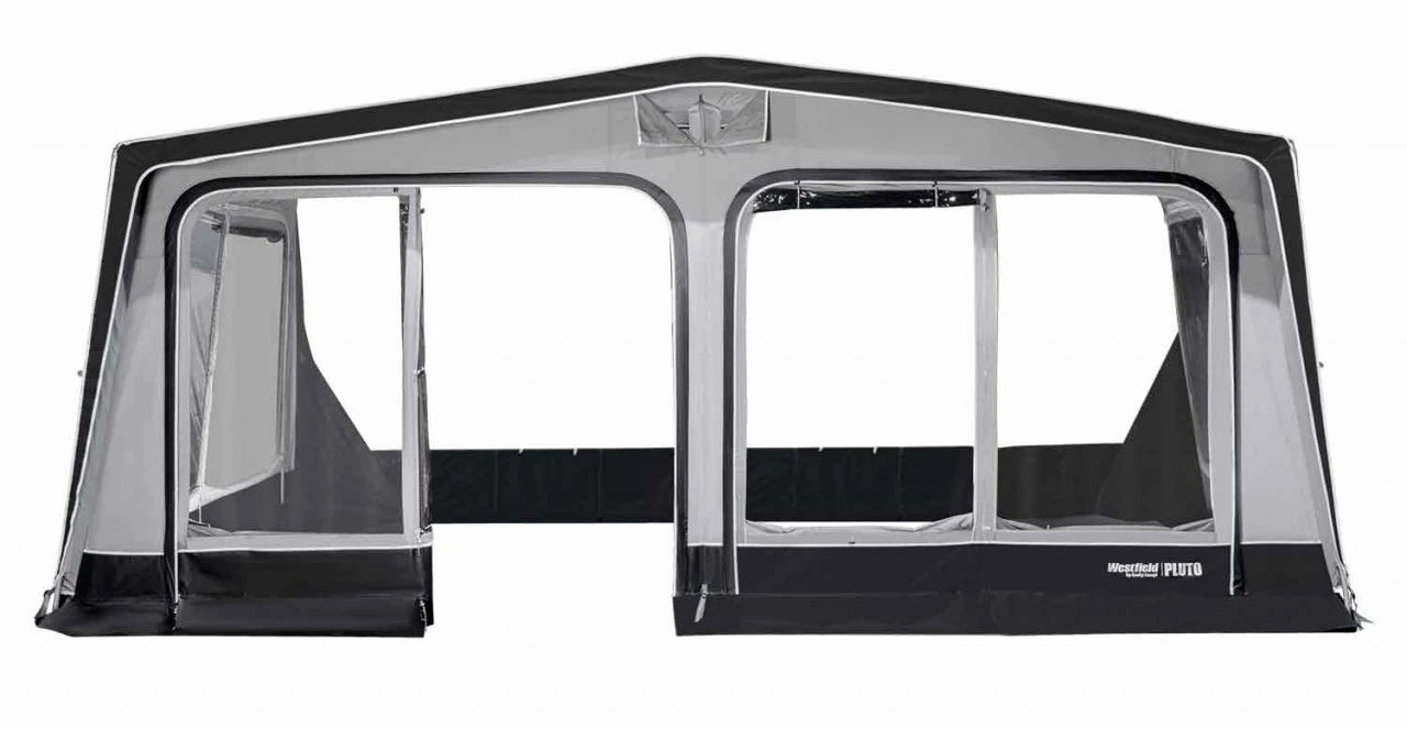 Das Westfield Pluto Wohnwagenvorzelt ist dein idealer Begleiter für deine nächste Reise, da es durch die AAS-Lufttechnik nur an einem Punkt aufgepumpt wird und das in wenigen Minuten. Es besteht außerdem aus dem reißfesten und strapazierfähigen HydroTech® CottonTouch-Material, welches speziell für Caravan und Reisemobile entwickelt wurde. Dieses Polyestergewebe ist besonders UV-beständig. Des Weiteren verleiht diese Beschichtung dem Zelt einen fühlbaren Baumwoll-Charakter. Durch den Volleinzug wird es ganz einfach in die Kederschiene eingezogen. Somit ist dir eine perfekte Abdichtung an den Seiten deines Caravans garantiert. Das Pluto Wohnwagenvorzelt besticht vor allem durch sein großzügiges Platzangebot im Inneren. Zwei Seitenwände sind mit einer getönten Fensterfolie ausgestattet, die zusätzlich auch über ein Moskitonetz verfügen und somit Insekten fernhalten. Die beiden Wände der Frontseite sind mit getönten Panoramafenstern, einer Tür und einem Moskitonetz versehen. An warmen Tagen besteht die Möglichkeit die Seitenwände des Zeltes zu entfernen und wie unter einem Pavillon im Grünen zu sitzen und die Natur zu genießen. Für ein gutes Zeltklima sorgt die dauerhafte Hochentlüftung, sodass in deinem Zelt ein angenehmes Klima herrscht.